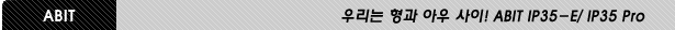 ABIT IP35 Pro´Â ¾Õ¼ »ìÆìº» IP35-E¿Í µ¿ÀÏÇÑ MCHÀÎ P35 Express¸¦ »ç¿ëÇϰí ÀÖÁö¸¸, »ç¿ì½ººê¸´Áö´Â ICH9R·Î S-ATA RAID¸¦ Ãß°¡·Î Áö¿øÇϸç, IEEE1394, µà¾ó ±â°¡ºñÆ® ÀÌ´õ³Ý, uGuru Ĩ¼Â, 8bit µð¹ö±× LED, Àü¿ø ¹× ¸®¼Â ½ºÀ§Ä¡¸¦ Á¦°øÇÏ´Â ABIT IP35 ½Ã¸®Áî Áß °¡Àå »óÀ§ Á¦Ç°ÀÌ´Ù. (ABIT IP35 Pro´Â ABIT¿¡¼ º¸³»¿Â »ùÇ÷Π¾ÆÁ÷ ±¹³»¿¡ ÆÇ¸ÅµÇÁö ¾Ê¾Æ ½ÇÁ¦ ÆÇ¸Å Á¦Ç°°ú´Â Â÷À̰¡ ÀÖÀ» ¼ö ÀÖ´Ù.)